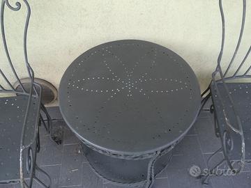 Set da giardino vintage in ferro battuto con due tavoli rotondi, due poltrone abbinate. Presentano eleganti lavorazioni a voluta e sedili traforati. Resistenti ed eleganti.