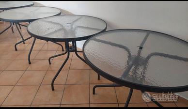 Vendesi in blocco, N. 8 tavoli da esterno, ferro con top in vetro, foro x ombrellone. Dimensione : Diametro 90 cm Altezza 73 cm