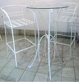 stupendo tavolino alto cm. 100 con piano in vetro da 60 cm. di diametro + 2 sgabelli alti cm. 100 con seduta da cm. 45x44x44tutto in ferro pieno forgiato e battuto amano (possibilita' di modificare misure altezza e larghezza e si possono avere anche poltroncine come da foto con sconto di 30 euro,, colore a scelta )
