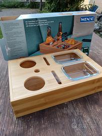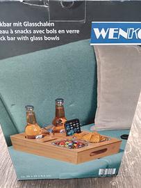 Tavolino bar in legno, con coppette in vetro e apri bottiglia.