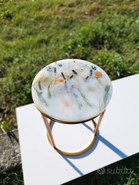 Tavolino da interno con piano in resina epossidica e fiori naturali essiccati. Tavolino laterale. Tavolino da caffè. Perfetto da salotto, camera da letto e come arredo originale. Fatto a mano. Pezzo unico. Diametro 38cm.