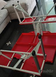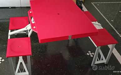 vendo tavolino da mare, da pic nic, camping, per poggiolo/terrazzo, richiudibile a valigetta, pratico da trasportare, si apre e richiude in maniera molto semplice, 4 posti a sedere. Buone condizioni, ritiro Sestri Ponente
