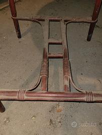 Tavolino rotondo in rattan diametro 80 cm x H 73 con buco centrale per inserimento piccolo ombrellone. Colore attuale rosso con qualche segno di usura da rinnovare con verniciatura. Ritiro a Piossasco (TO)