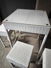 n.1 tavolo alto in rattan bianco con vetro, cm. 80 x 80 n.4 sgabelli alti in rattan bianco disponibili 4 tavoli e 16 sgabelli.