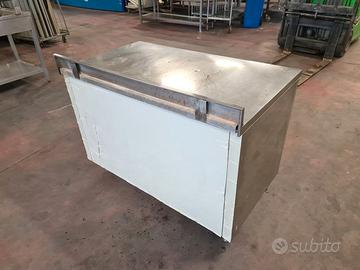 tavolo armadiato con anta scorrevole usato, si tratta di un tavolo armadiato in acciaio inox di lavoro dotato di alzatina e ripiani interni. purtroppo manca un'anta. dimensioni: 120X70cm h92cm, ripiano 115X56cm