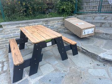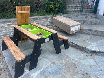 Vendo tavolo bambini da esterno tutto in legno appena smontato ridato tutto l'impregnante e rimontato, perfetto, il modello più bello con panche regolabili , ombrello e sabbiere interne