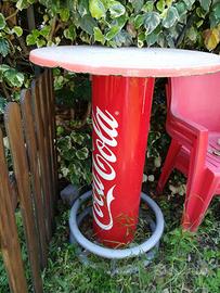 Tavolo Coca Cola alto e con supporto piedi e con il piano superiore leggermente sbiadito dal sole. Appunto per causa di questa piccola imperfezione, che comunque non inficia né l'utilizzo né la visione della memorabile scritta del brand Coca Cola, lo propongo ad un prezzo più simbolico che realmente legato al suo valore commerciale che in ovvio sarebbe certamente di molto superiore.