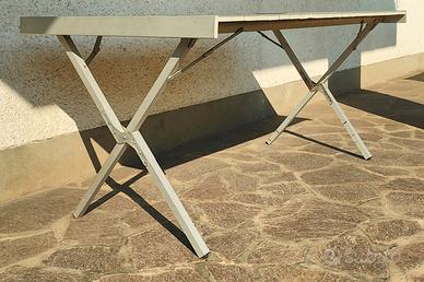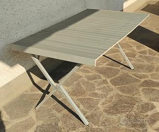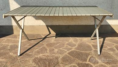 Pratico tavolo con piano arrotolabile in pannelli di alluminio.