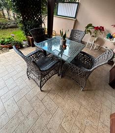 Tavolo con ripiano in vetro e 4 sedie con cuscini, colore grigio scuro. Misure 1 metro X 1 metro. Ottime condizioni come da foto.