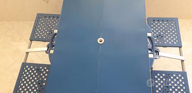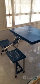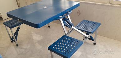 Vendo tavolo con sedie da pic nic color blu Richiudibile a valigia. In scatola originale. È possibile inserire al centro ombrellone nell'apposito foro. In plastica resistente. Dimensioni a valigia: lunghezza cm 84 altezza cm 33 e spessore cm 10.