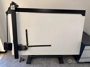 in profilato di alluminio con rettifica dei carrelli ,guide di scorrimento e cuscinetti in acciaio, goniometro a 360° con indice variabile, formato 100x170 cm bloccaggio dello scorrimento verticale e orizzontale, bilanciamento con molle.