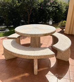 Tavolo da esterni in granito con 3 panchine. Perfetto per un giardino. Il prezzo non comprende l’eventuale trasporto.