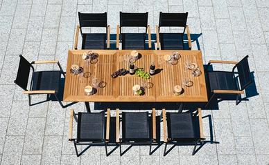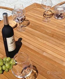 Tavolo in alluminio antracite opaco, allungabile, dimensioni 150/210 x 90 cm, piano in legno di teak.