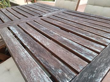 tavolo allungabile in legno da esterno + 4 sedie a sdraio coordinate con cuscini da.esterno da rioliare e/ o riverniciare il tavolo presenta imperfezioni come da foto ritiro a carico acquirente