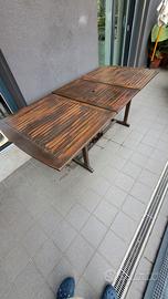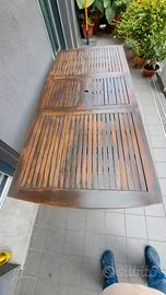 Tavolo rettangolare in legno dimensioni 150x90 cm allungabile fino a 200x90 cm con foro (sulla parte di allungo) per ombrellone. Lo vendo perché è troppo grande per le attuali dimensioni dello spazio esterno.