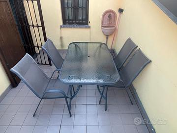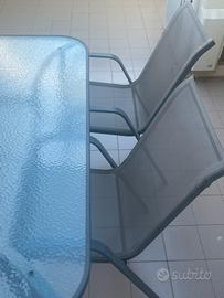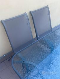 Tavolo da esterno in acciaio grigio scuro con top in vetro satinato 150x90 venduto con 4 sedie in tela e acciaio grigio scuro di 55cm.