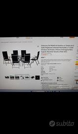 Tavolo da esterno in alluminio con piano in vetro temperato, completo di 6 sedie con braccioli reclinabili. Pari al nuovo, acquistato estate scorsa (500€ come da foto), gia' smontato e di facile trasporto. Vendo per cambio abitazione. Se acquistato insieme al set di divani simil rattan di colore bianco il prezzo finale in blocco è 460€ con un risparmio quasi del 50% visto che sono praticamente nuovi.