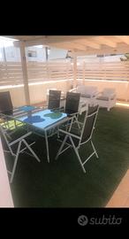 Tavolo da esterno in alluminio con piano in vetro temperato, completo di sei sedie con braccioli reclinabili. Pari al nuovo, acquistato estate scorsa (500€), gia' smontato e di facile trasporto. Vendo per cambio abitazione.
