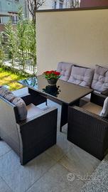 Vendo Arredo giardino elegante. Consegno senza smontarlo se in zona Monza e brianza. 2 Poltrone da Esterno, 1 Tavolo con base in Vetro, 1 Panca da 3 persone, 2 Sgabelli. Il tutto completo di cuscini. Usato solo una stagione.