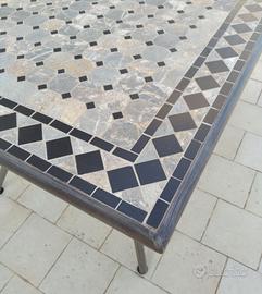 Tavolo da esterno/giardino, cm 160x90, altezza cm 75. Piano in gres porcellanato e pietre naturali a mosaico su telaio metallico. Il mosaico è solido, perfettamente integro e come nuovo. La struttura metallica in ferro smaltato grigio antracite è robusta e sana. Pesante. Smontabile. I fissaggi con 20 viti sono sani con 2 difettosi. Visionabile e ritirabile in loco. Disponibile ascensore per spostamento a piano strada previo smontaggio.