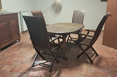 tavolo ovale da esterno, in legno. lunghezza 150 cm, allungabile fino a 200. larghezza 106 cm. abbinato a 4 sedie con braccioli sempre in legno. usato ma in buone condizioni generali, sempre tenuto in taverna. disponibile per ritiro a mano o a consegna nel raggio di 15 km.