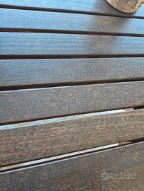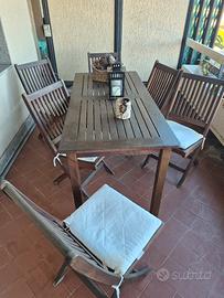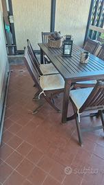 Tavolo da esterno in teak con sei sedie pieghevoli, marchio Unopiu misure altezza da terra 75 cm, largo 70 cm, lungo 154 cm. condizioni del tavolo buone (sicuramente va trattato e levigato) le gambe del tavolo e delle sedie leggermente macchiate dall'acqua
