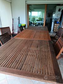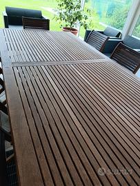 Vendo tavolo in tech da esterno Con dieci sedie come in foto e 2 sedie con braccioli. Dimensioni da chiuso 120x240x74h cm Dimensioni da aperto 120x360x74h cm Solo ritiro in loco, non spedisco perché troppo voluminoso Prezzo trattbile
