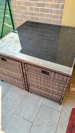 Tavolo 120x120 da esterno per giardino con 4 sedute,compreso di cuscini e tavolini bassi/poggia piedi. Top in vetro, usato poco; da pulire