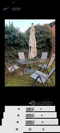Tavolo da giardino rettangolare in acciaio con vetro temperato , ombrellone e 5 sedie con tessuto a rete .