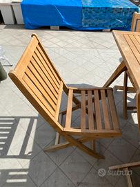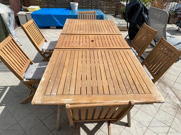 Tavolo in legno di acacia misure 180/230x100 + 6 sedie sempre in legno di acacia pieghevoli. Da trattare per manutenzione ordinaria con prodotto per legni duri. Una sedia manca di un listello sulla seduta