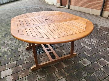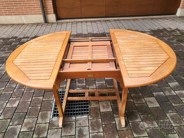 tavolo da giardino Alexander, diametro 120 cm oppure 120x170 (50 cm di prolunga), in legno di qualità e di elevata resistenza. la prolunga è a scomparsa senza la necessità di doverla riporre altrove.