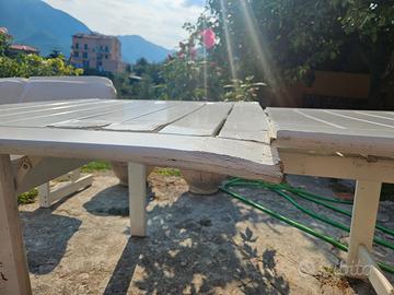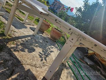 Vendo tavolo smontabile con panche della Foppapedretti anni 80. Il tavolo è leggermente danneggiato sui pianali. Il telaio in buone condizioni. Le panche sono in ottimo stato.