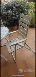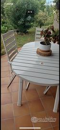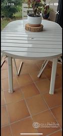 Vendo causa sostituzione tavolo da esterno (allungabile) completo di 6 sedie. Soni presenti sul tavolo 2 buchi come predisposizione per eventuali ombrelloni. Sedie regolabili come schienale.