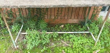 Tavolo da giardino in marmo travertino, con telaio in ferro. Le misure della lastra di marmo sono: lunghezza 153cm, larghezza 70cm, spessore 3cm. Zona nord di Messina, vicino a Ganzirri.