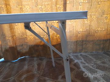 Tavolo in metallo plastificato bianco. Da esterrno, richiudibile fino a spessore di cm. 15. Altezza cm. 72, larghezza cm. 80, lunghezza minima cm. 134. Dotato di 2 prolunghe di lunghezza cm. 50 ciascuna, montabili anche singolarmente, per una lunghezza massima del tavolo di cm. 234. Usato ma in ottime condizioni. Non disponibile per la spedizione.