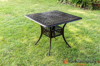 Tavolo da giardino modello Primula realizzato in alluminio color bronzo, dal