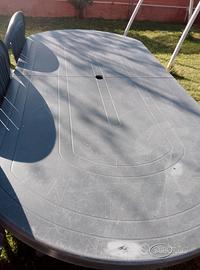 tavolo da giardino Grand Soleil, con segni del tempo ma in ottimo stato, componibile da 6 a 8 posti, nessun pezzo mancante dotato di elemento per allungamento del tavolo e 5 sedie in ottime condizioni. Misura 150cm x 90cm allungabile fino a 200 cm. Già smontato pronto per il trasporto.Prezzo marginalmente trattabile. Ritiro in zona Ostia Antica.