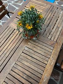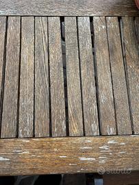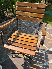 Tavolo da giardino in legno e ferro. 120x70, h 72 cm. Parte superiore leggermente scrostata (vedasi foto). 4 sedie coordinate. Sia il tavolo che le sedie sono pieghevoli.