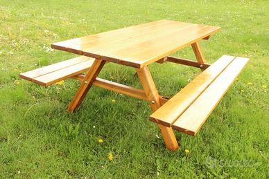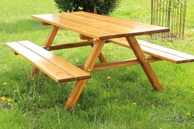 Tavolo da giardino, con panchine da 6 posti, realizzato in legno massello.