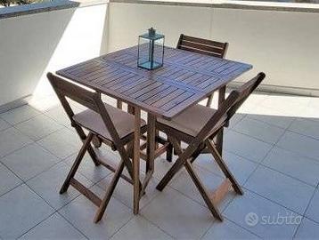 Tavolo in Acacia pieghevole (da aperto 110x80x75h) (da chiuso 90x37x75h). Si chiude su due lati e consente di riporre le 4 sedie pieghevoli nel mezzo. Acquisto 2023 e usato pochissimo. Il prezzo non comprende spedizione.