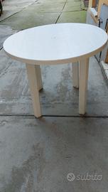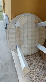 Tavolo da giardino rotondo in resina bianca. Le quattro gambe si possono togliere per renderlo trasportabile. Al centro ha un foro per infilarci comodamente un ombrellone