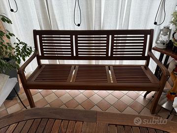 Tavolo allungabile da giardino, panca e sedie in legno, posizionato il tutto sempre all’interno. Misura tavolo 150 allungato 200 largo 100 Panca lunga 155 4 Sedie richiudibili