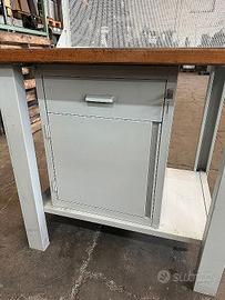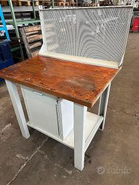 Tavolo da lavoro con piano in legno 1000x730 h900 mm con cassetto ed armadietto. Ha una alzata in ferro per attaccare chiavi, ecc