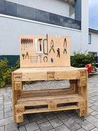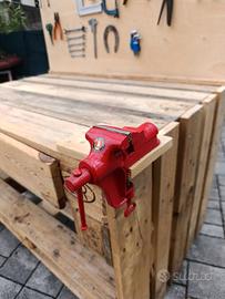 Tavolo da lavoro artigianale costruito con epal semi-nuovi, due cassetti, ruote, morsa e spalliera per attrezzi (non inclusi nella vendita). Ottimo per box o piano di lavoro, oppure come esposizione.