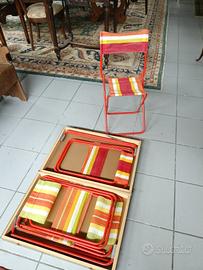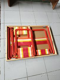 Valigia Pic nic anni 70 buone condizioni,correlata di 4 sedie in tessuto e ferro.Ideale x mare,campeggio giardino.Disponibilita di ritiro in loco Matera,disponibilità spedizione in tutta Italia previo accordi.Tel 393 6505156