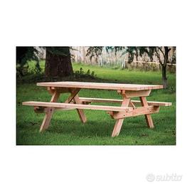 Tavolo da picnic in legno di castagno con 2 panche integrato alla struttura e angoli arrontondati, in legno massello robusto, ideale per il giardino. Dimensioni 2 metri