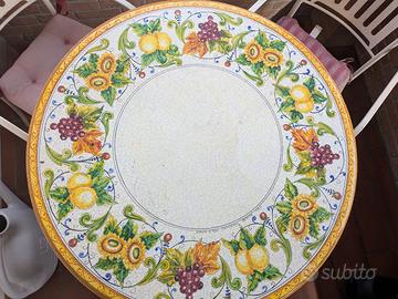 Bellissimo tavolo in pietra lavica Domiziani Deruta dipinto a mano con due sedie abbinate. Il tavolo è in buone condizioni, le sedie hanno qualche segno di ruggine superficiale.