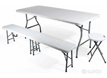 Tavolo pieghevole con struttura in metallo verniciato e piano in plastica HDPE.