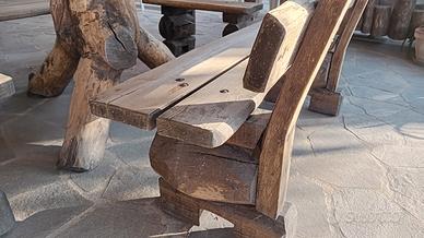Set da giardino composto da tavolo e 4 panche. Legno massiccio , tronchi veri. Per esterni, giardini, baite. Struttura robusta. Design rustico ideale per creare uno spazio conviviale all'aperto. Necessita di un restauro amatoriale a causa del tempo. Misure: TAVOLO 122 x 63 cm h 75 cm PANCA GRANDE 118 x 30 cm altezza dalla seduta a terra 35 cm, altezza compreso schienale 77 cm PANCA PICCOLA 66 x 33 cm altezze come panca grande. RITIRO ORGANIZZATO DALL' ACQUIRENTE pezzi pesanti un po' ingombranti