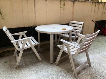 Tavolo spazioso con 3 sedie in plastica robusta. Ritiro a carico dell’acquirente.